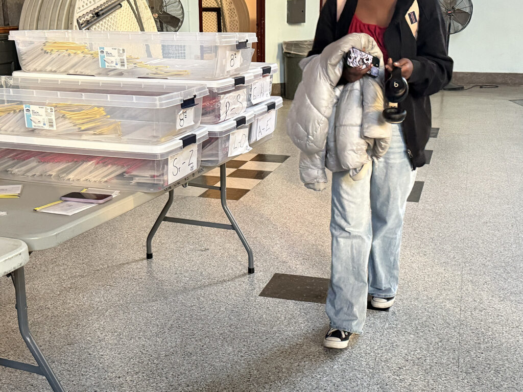 At Celia Cruz Bronx High School of Music, there’s a structured system for collecting and managing students’ devices each morning. Students line up to hand in their phones, which are placed in labeled ziploc bags, and sorted alphabetically. Faculty manage the bins, and students provide their name or number attached to their device to ensure proper sorting.